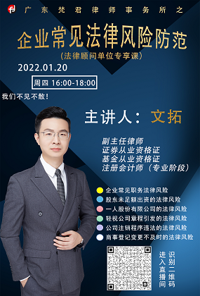 为了进一步提高顾问单位的服务体验,帮助顾问单位提前预防法律风险,梵君律所副主任文拓律师将于1月20日,周四16:00-18:00,以线上直播的方式,为梵君法律顾问单位开展企业常见法律风险防范专享培训课程。