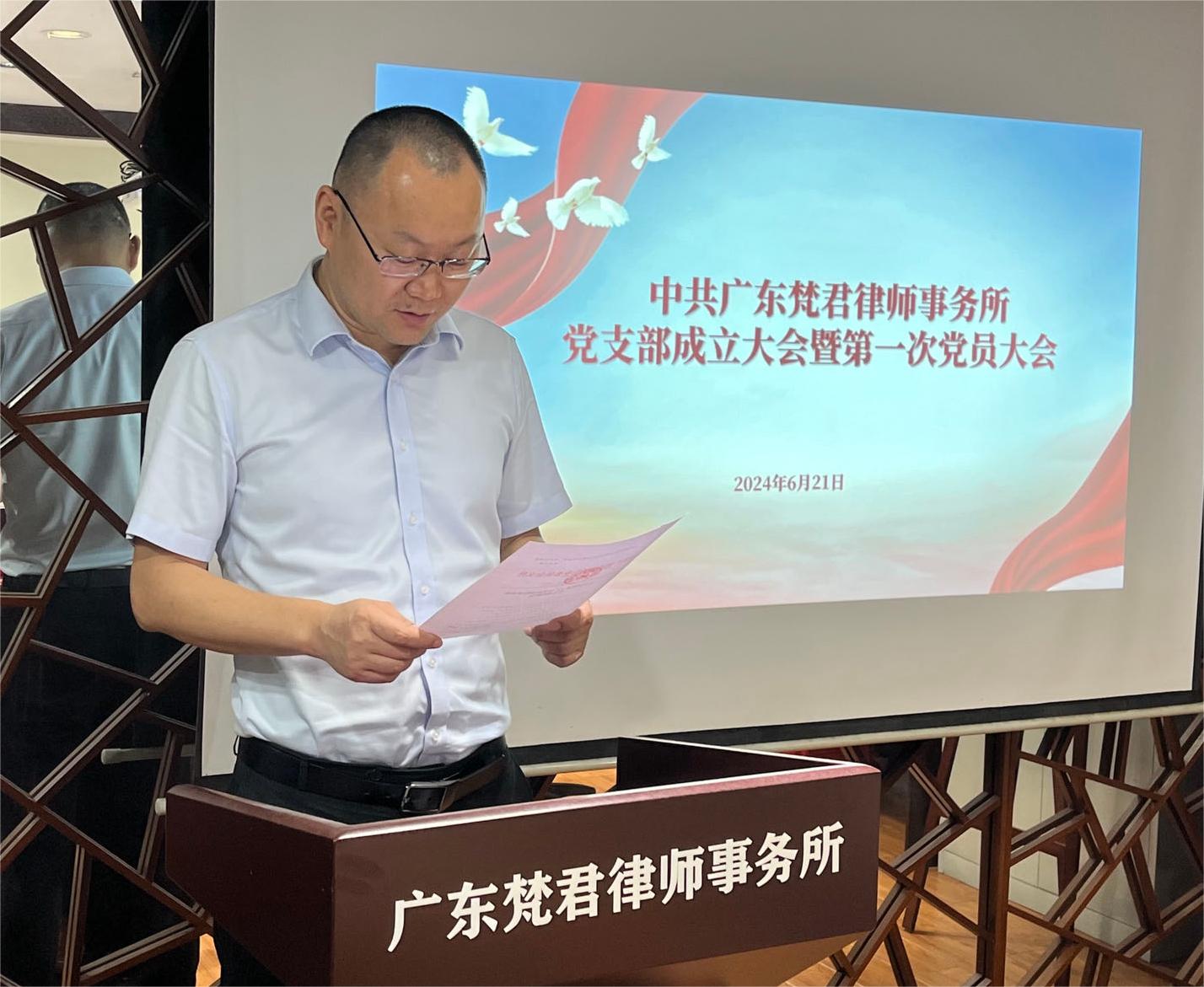 会议严格按照《中国共产党章程》、《中国共产党基层组织选举工作暂行条例》及有关规定进行,秩序井然,庄严肃穆。会上,广东梵君律师事务所主任严兵宣读了《中共广州市律师行业委员会关于同意广东梵君律师事务所申请成立党支部的批复》。