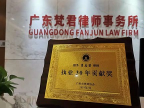 | 执业30年贡献奖:系广州市律师协会为了表彰对行业发展作出贡献的律师,向执业时间超过30年且仍在从事律师业务的律师颁发的贡献奖。 |