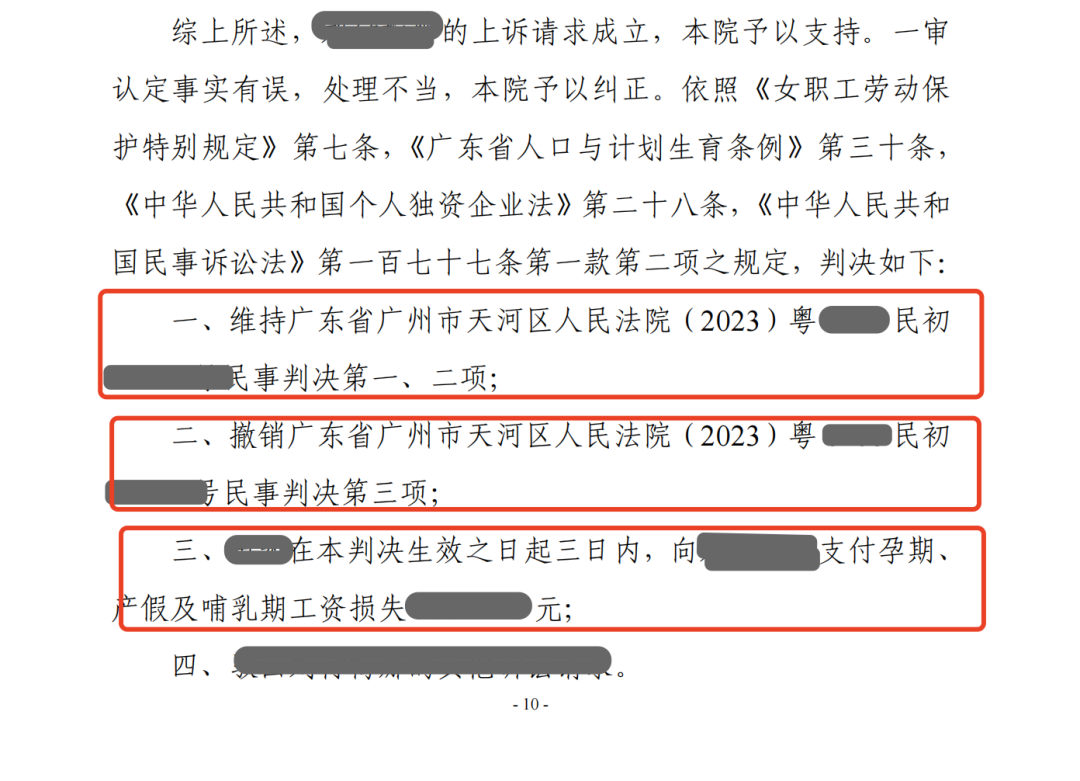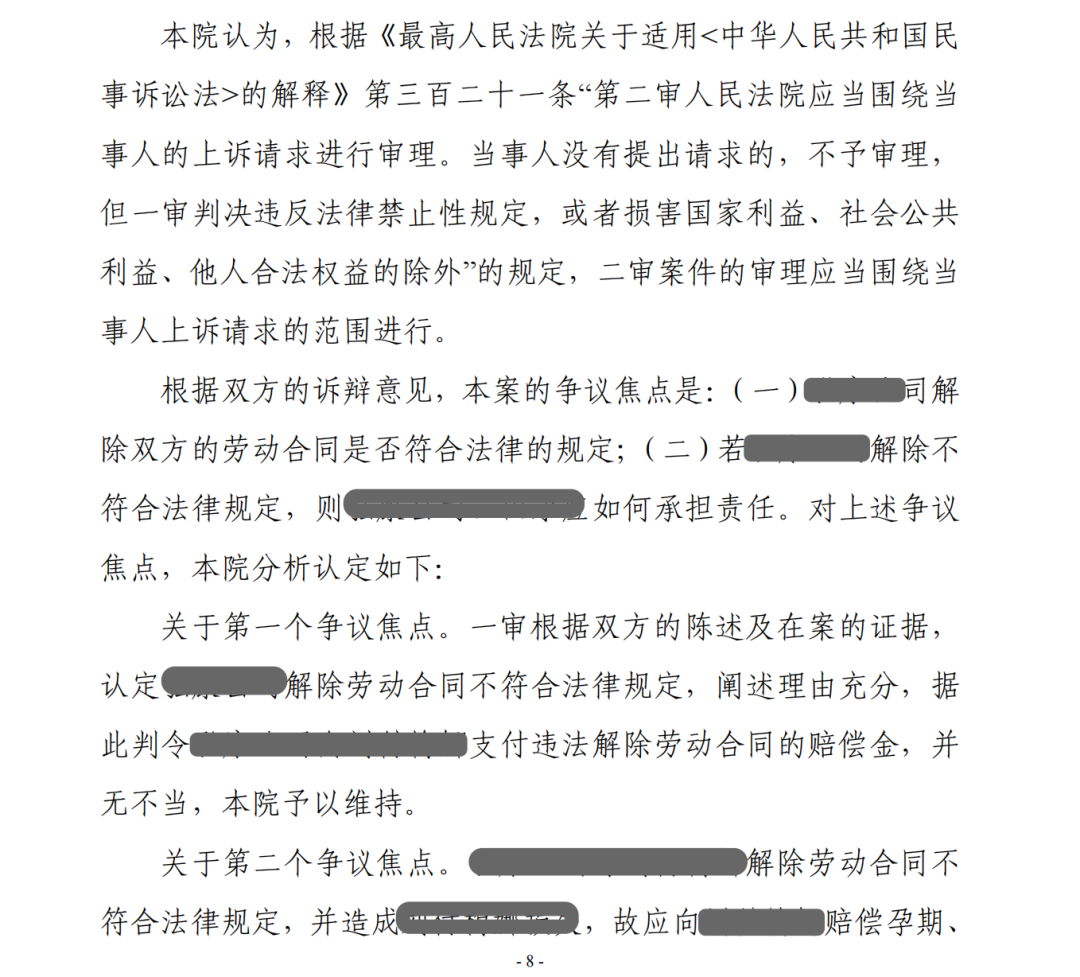 结果:二审采纳律师观点,认定公司解除劳动合同不符合法律规定,并造成A损失,故应向A赔偿孕期、产假及哺乳期的工资待遇损失。