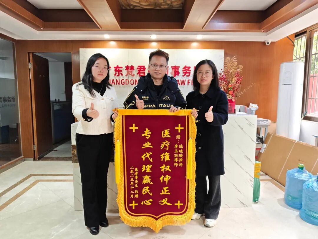 2026年2月1日,委托人李先生和家人特意从东莞来到我所,郑重地将致谢锦旗送给了李玉丽、陈晓璇律师团队,当面感谢两位律师的专业帮助。